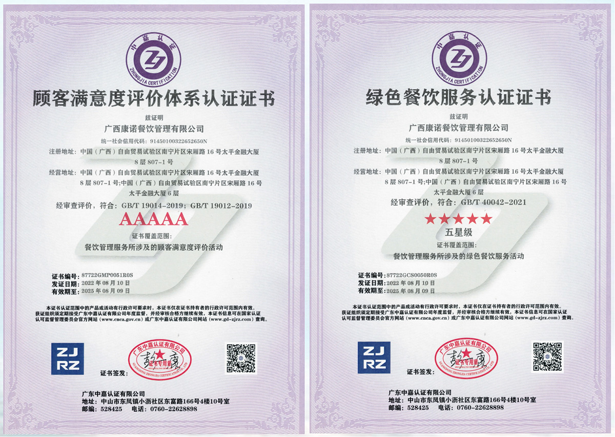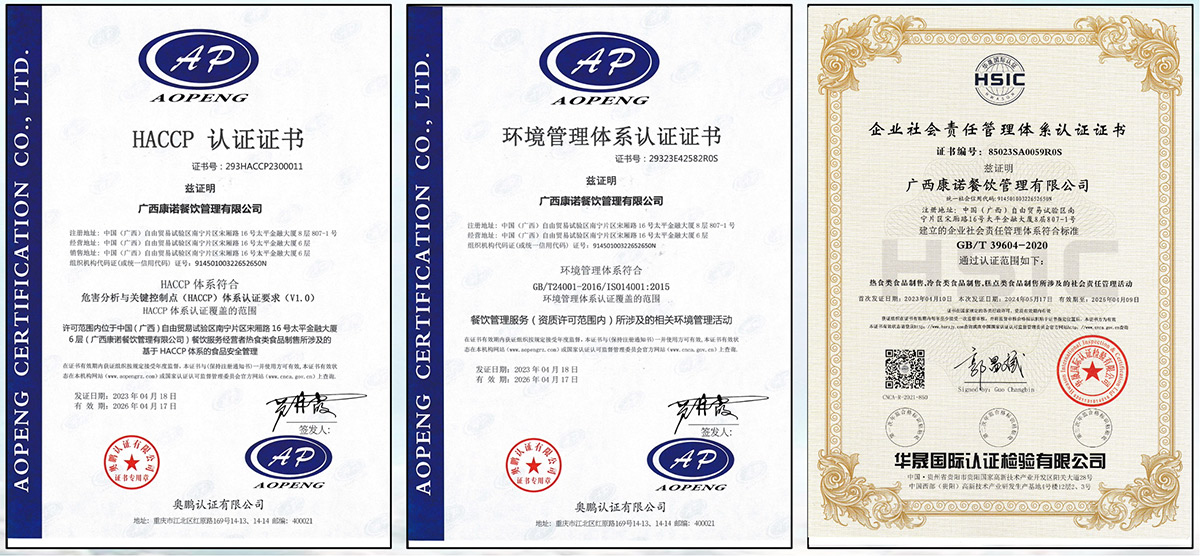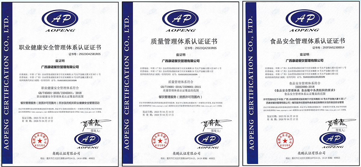 作为专业的团餐综合服务商,康诺在承包企事业单位食堂行业有着丰 富的管理经验及全新的经营理念 ,实行连锁承包、连锁经营、联合 经营等全新经营模式,为企事业单位并包含学校、医院、机关单位、 写字楼等提供团餐服务。康诺公司已通过 ISO22000、 ISO14001、 ISO45001、 ISO9001、HACCP认证,并先后荣获 “重合同守信企业”、 “诚信经营示范单位” 、 “全国优秀餐饮企业”。 康诺重视以人为本,拥有一批高级管理人才和优秀的厨师人才队伍, 配备了专业的营养配菜师、品保员等;康诺建立服务中心和培训中心, 研究中西方饮食文化和各地的口味差异,按照客户需求量身定制不同 的餐饮解决方案,为满足不同客户人员的营养和口味需求提供服务。